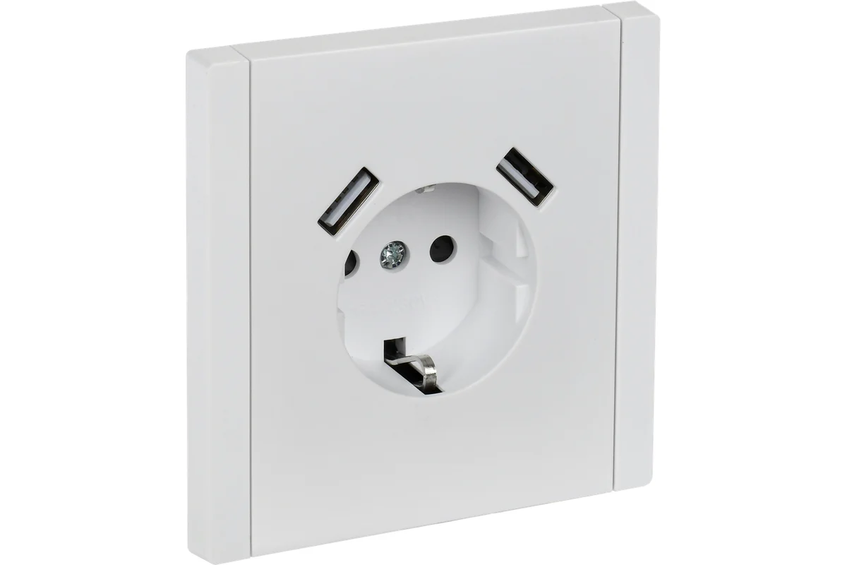 Электрическая розетка на 16А с заземлением и двумя портами USB-A (суммарный ток 3.1А). С защитными шторками, винтовое крепление. Серия FP245. Белый цвет. Для зарядки электронных устройств.