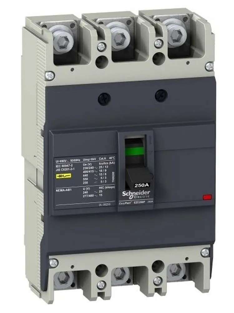 Easypact EZC250F представляет собой 3-полюсный стационарный автоматический выключатель, предназначенный для защиты низковольтных электроустановок. Он используется для стандартных приложений в отраслях промышленности и зданиях, обеспечивая высокую производительность по конкурентоспособной цене Отключающая способность (Icu) составляет 18 кА действ. при 415 В переменного тока 50/60 Гц. Рабочее напряжение 550 В переменного тока, 50/60 Гц или 250 В постоянного тока. Номинальный ток термомагнитного расцепителя составляет 160 А. Расцепитель обеспечивает фиксированную защиту от перегрузки и мгновенную защиту. Эта 3-полюсная версия (105 x 165 x 60 мм) поставляется с множеством дополнительных функций и аксессуаров.